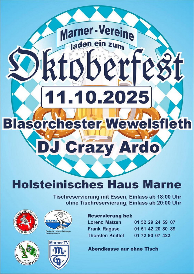 Die Marner Vereine laden ein zum Oktoberfest mit dem Blasorchester Wewelsfleth und DJ Crazy Ardo.