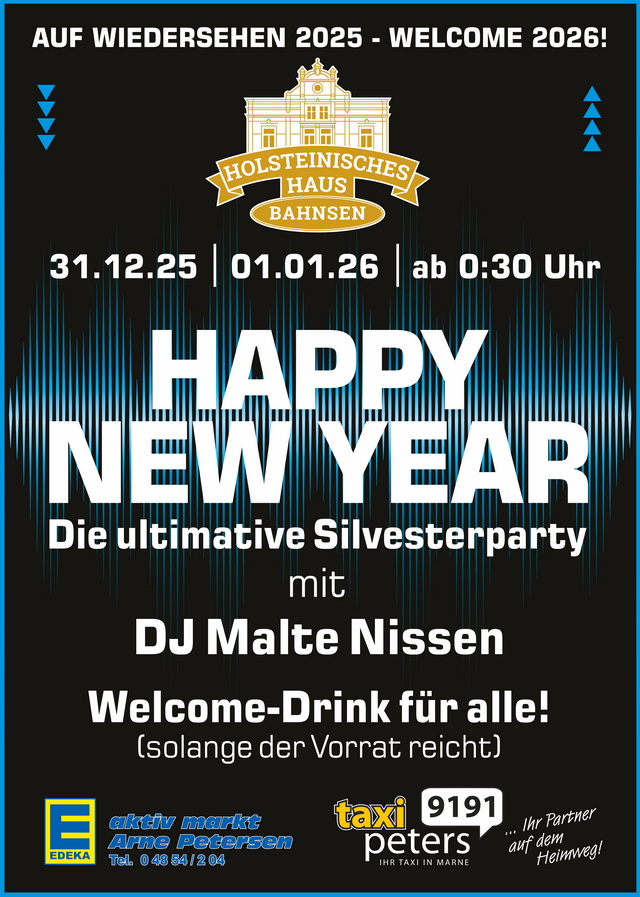 Die ultimative Silvesterparty mit Malte Nissen. Feiert mit uns das neue Jahr 2026. Einlass ab 00:30 Uhr am Neujahrstag. Welcome-Drink für alle (solange der Vorrat reicht)