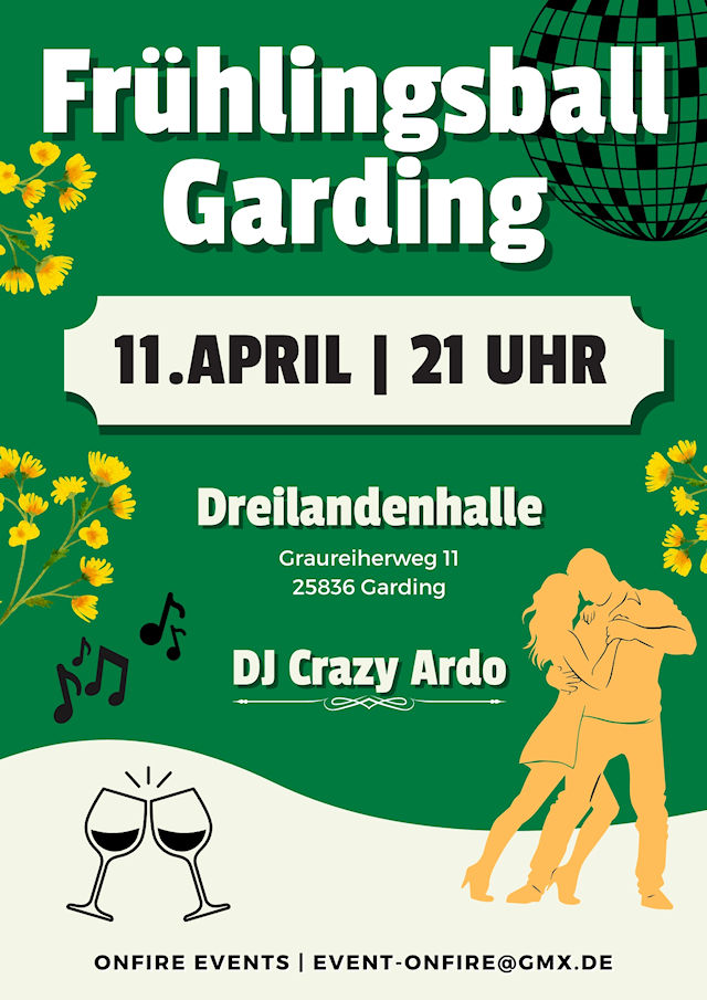 Zum ersten Mal findet der Frühlingsball in der Dreilandenhalle in Garding statt! Wir laden Jung & Alt zu einer unvergesslichen Nacht voller Tanz, Spaß und frühlingshafter Stimmung ein.